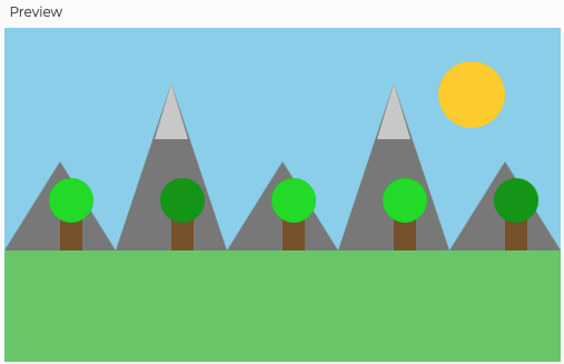 Crea un programa en p5.js que dibuje un paisaje simple (por ejemplo: cielo, suelo, montañas, sol, árboles…).