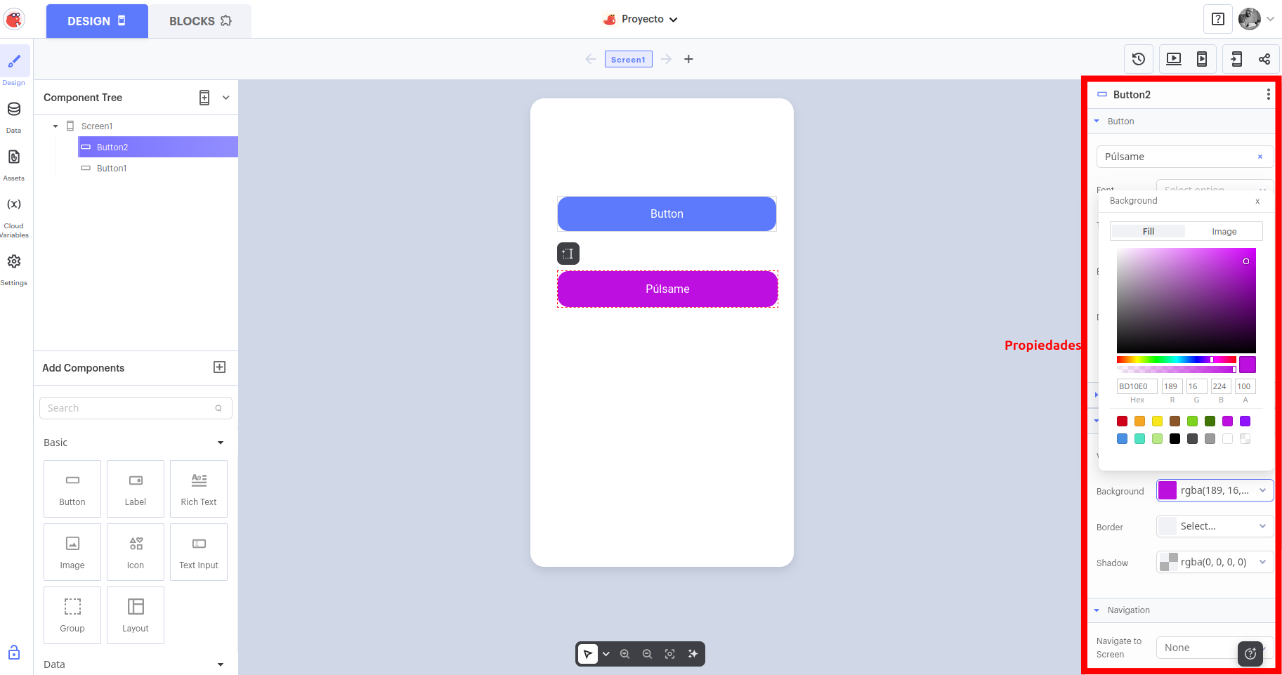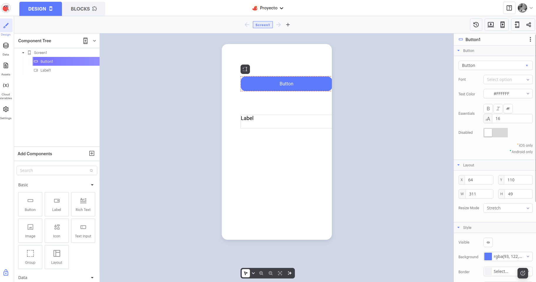 - Arrastra desde Add Components (parte izquierda) un Button a la pantalla de tu app.