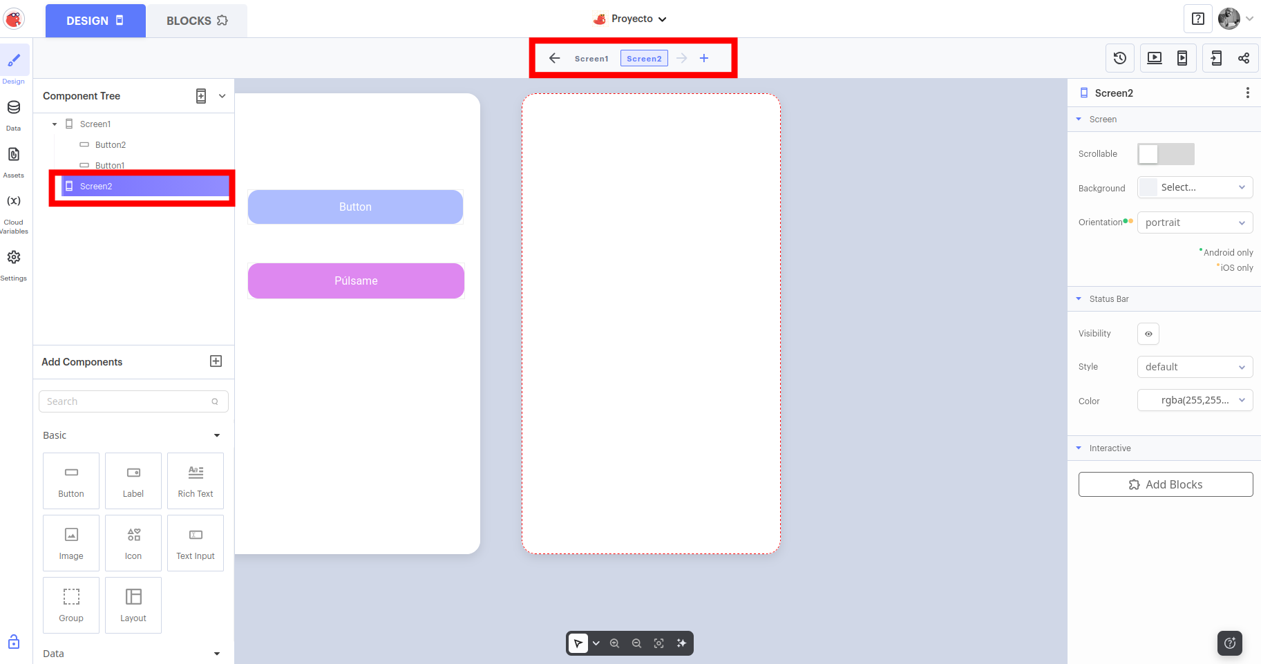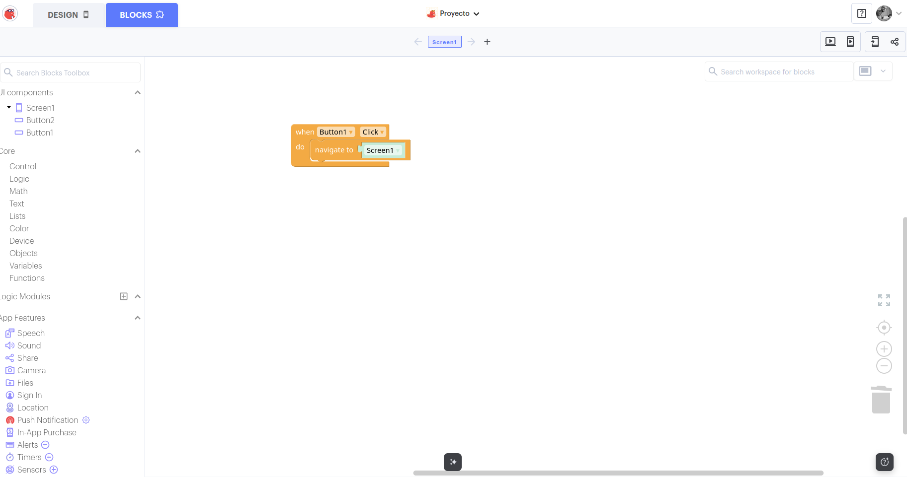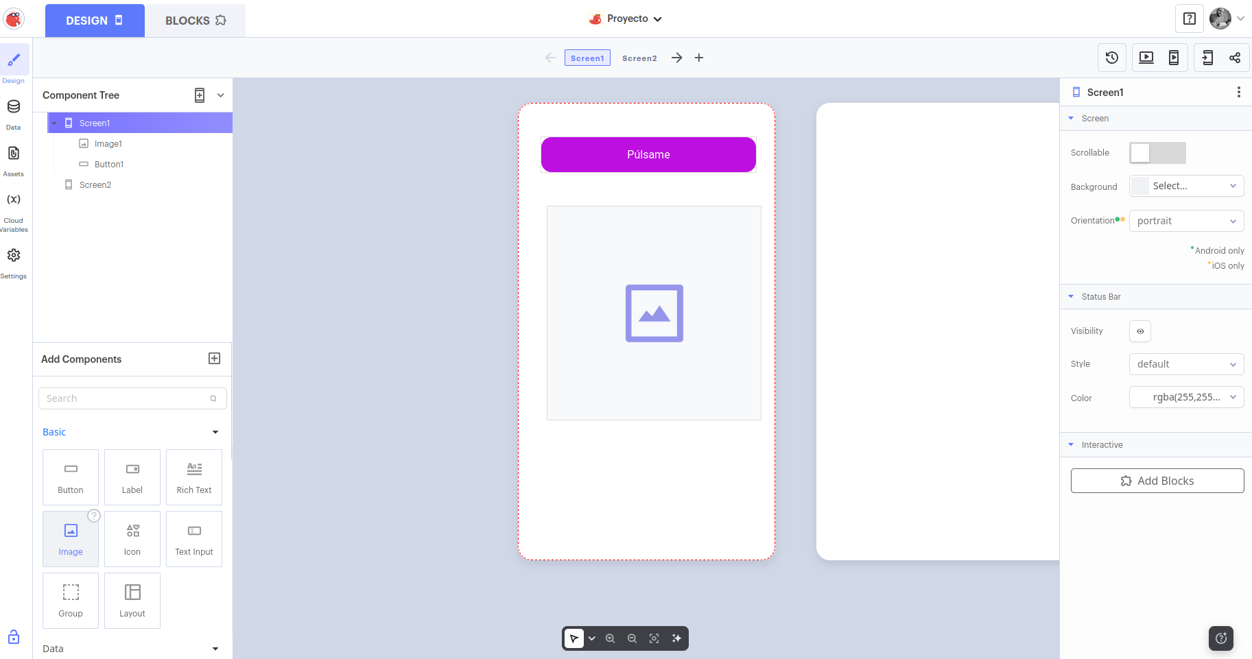 - Blocks (Bloques) 👉 para programar el comportamiento de la app.