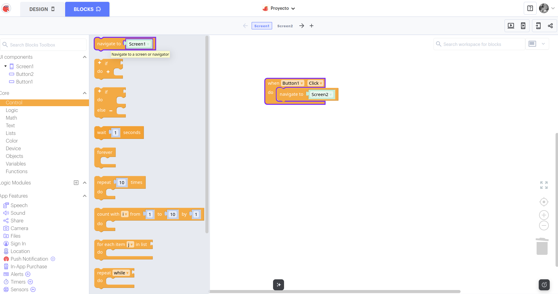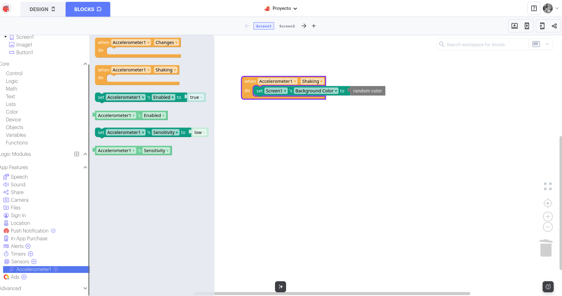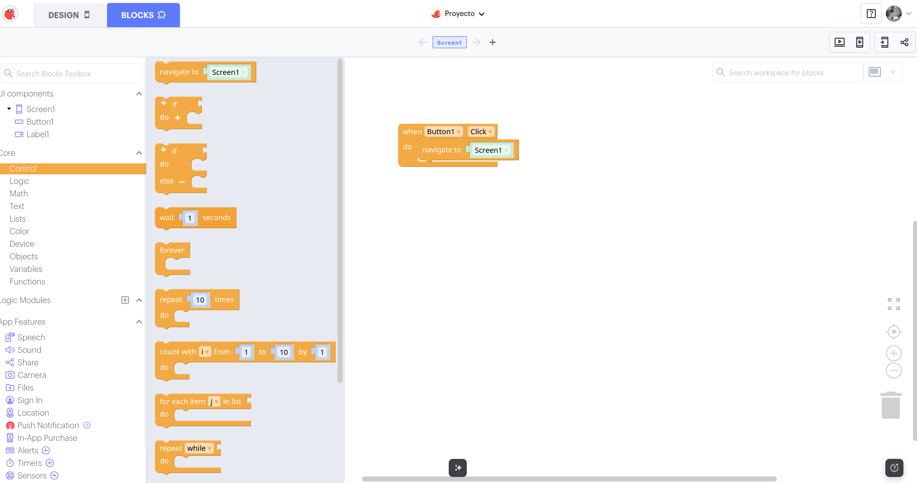 - Blocks (Bloques) 👉 para programar el comportamiento de la app.