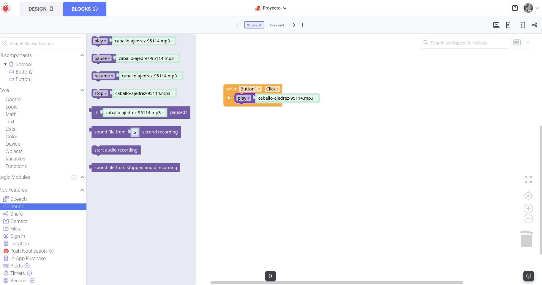 - Arrastra el componente Sound.