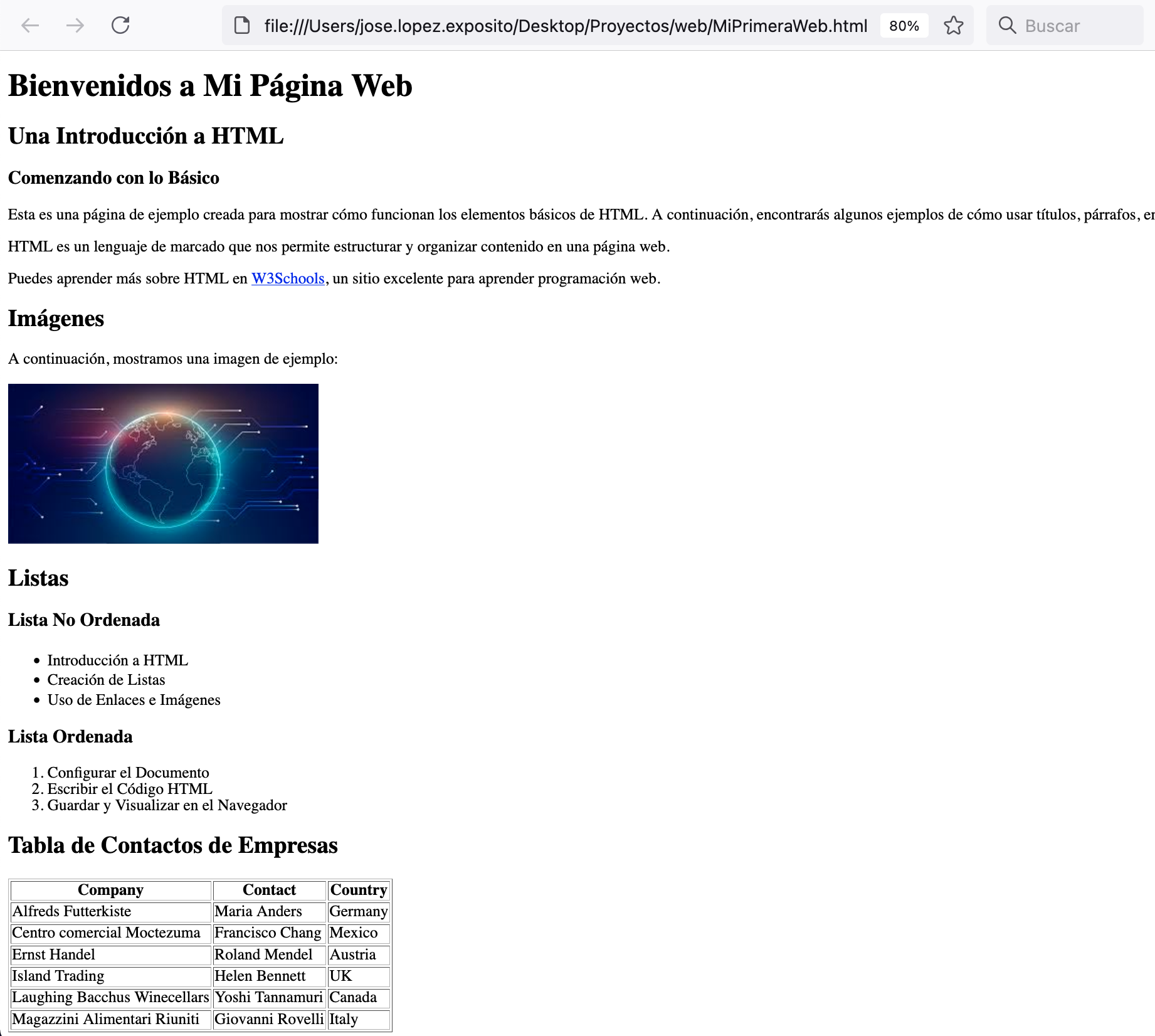 <p>Esta es una página de ejemplo creada para mostrar cómo funcionan los elementos básicos de HTML. A continuación, encontrarás algunos ejemplos de cómo usar títulos, párrafos, enlaces, imágenes, listas y tablas.</p>