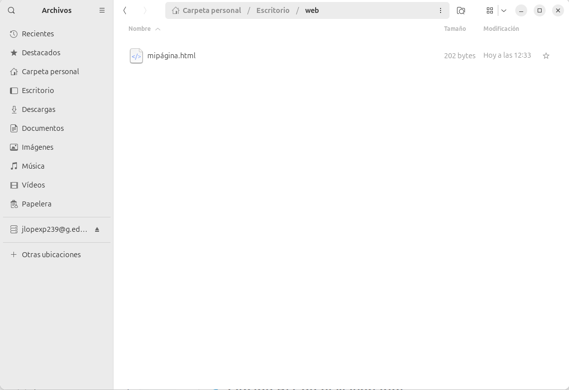 Ahora abre el Explorador de archivos y entra en la carpeta donde lo guardaste (por ejemplo, Documentos). Verás que el archivo tiene un icono diferente. Eso significa que el sistema ya lo reconoce como una página web. En este momento has convertido un simple archivo de texto en una página web real.