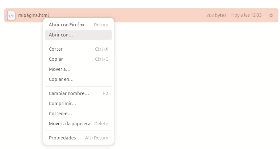 Si haces doble clic (o clic derecho → abrir con navegador), se abrirá en Firefox o Chromium y verás la página web visualmente.